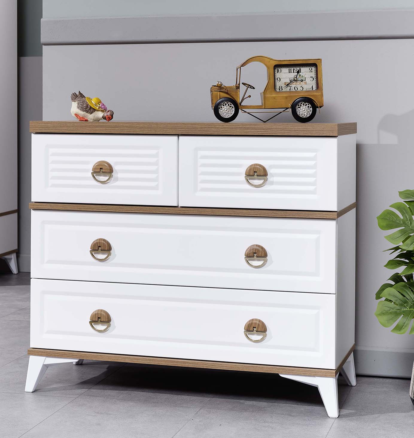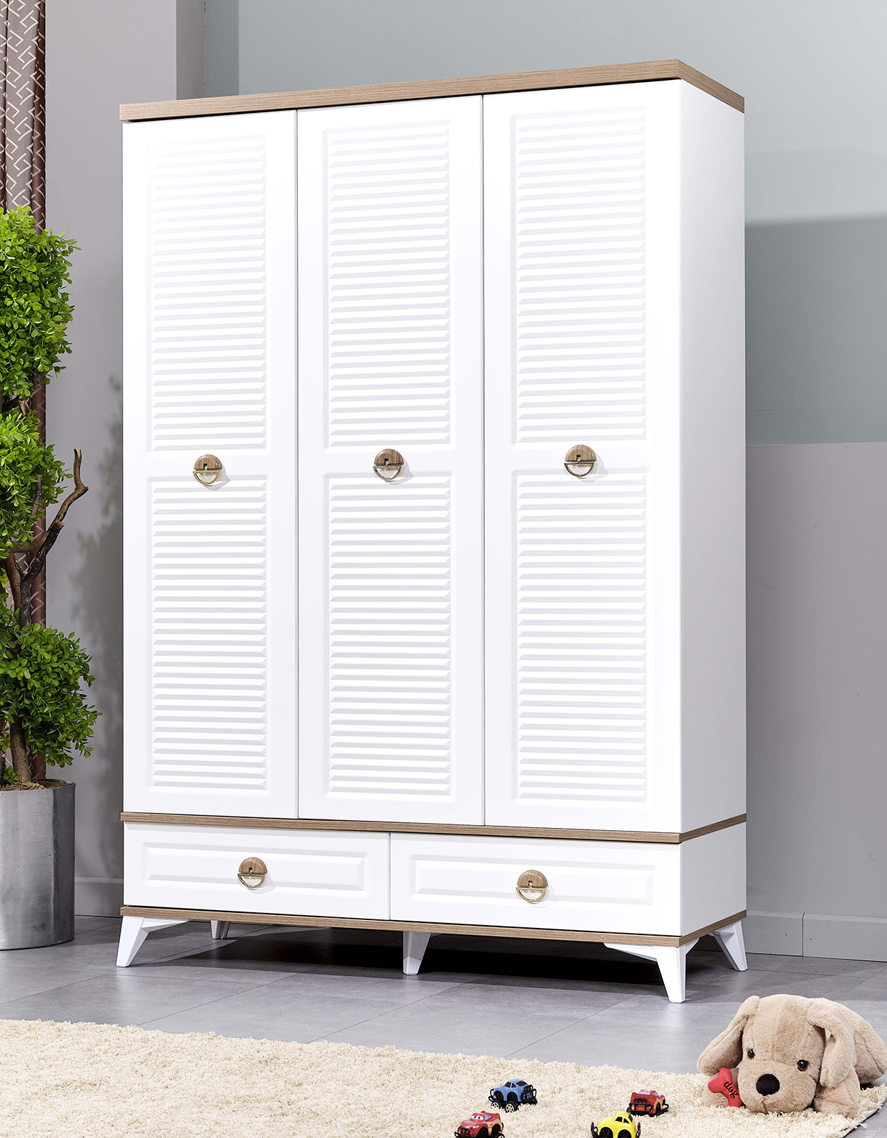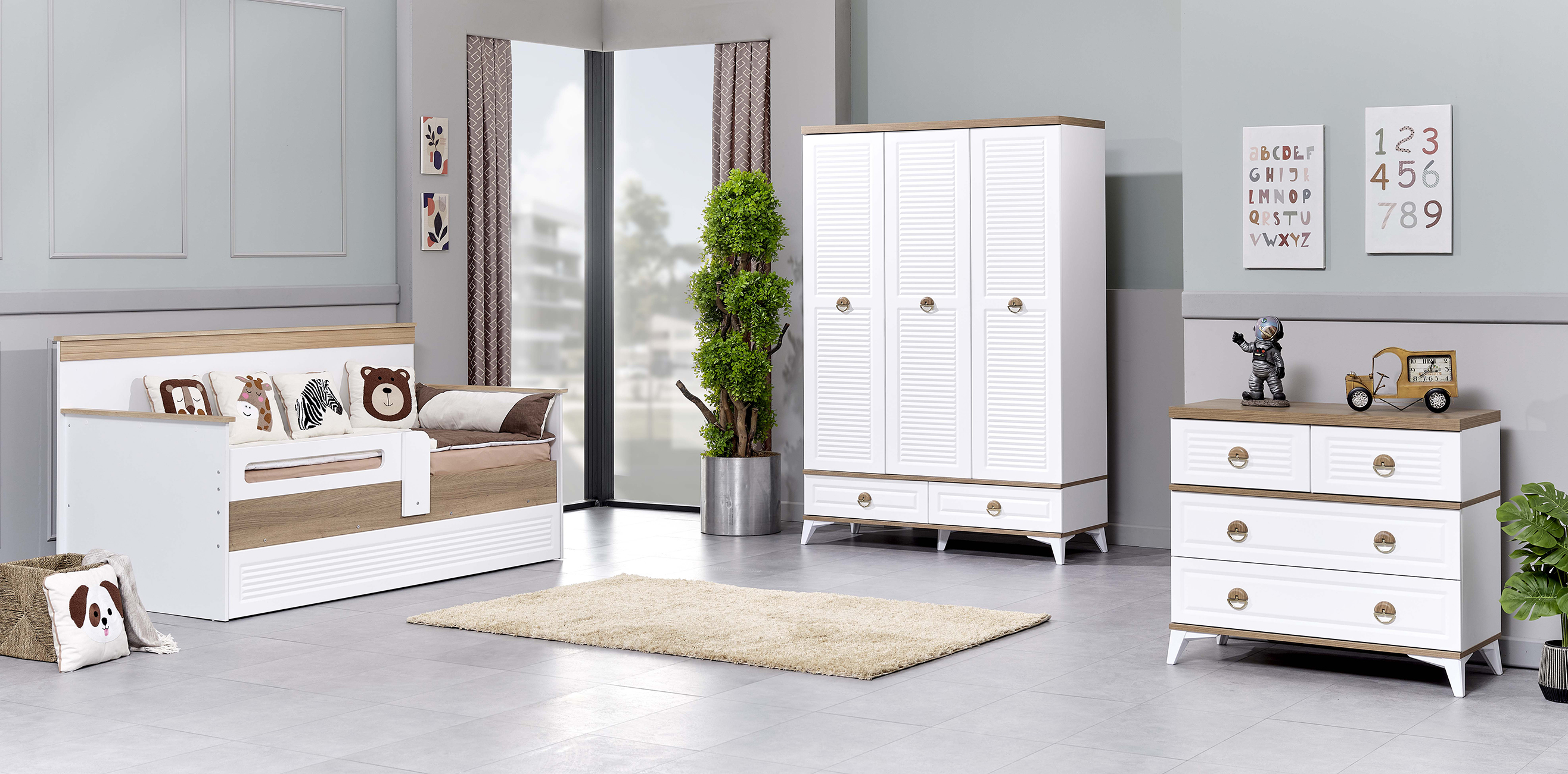 Kıyafet dolabının yanı sıra, düzen sağlamak İsteyen çocuklara bol çekmeceli geniş hacimli bir şifonyer tasarladık. Lucca ile odanda vakit geçirmek çok keyifli!